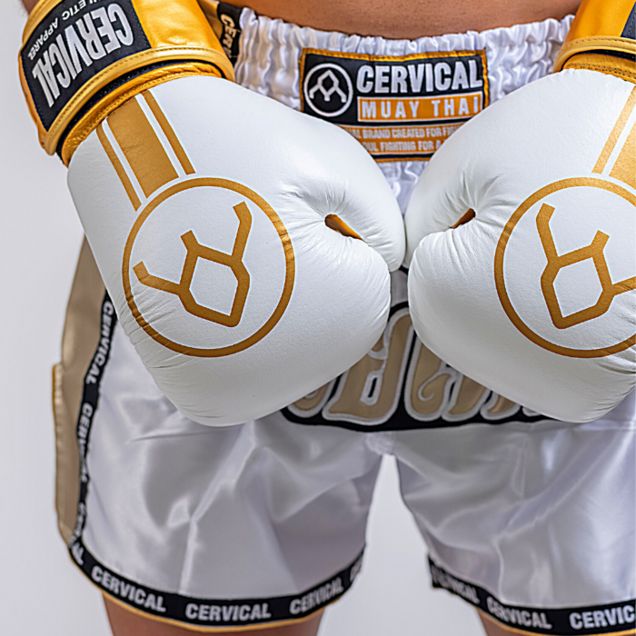 The Cervical Golden Series Muay Thai Shorts (Black and Gold) and (White and Gold) provide you with both comfort and a stylish flair. They feature an extra wide cut in the leg area so as to allow the very most freedom of movement when kicking, performing knee strikes, and defensively checking kicks. They are ideal for both training and competition in Muay Thai or any MMA workout